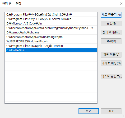 (C드라이브에 압축해제했을 경우 경로 : C:\Flutter\bin )