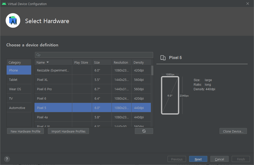 22. Pixel 5 클릭 후 Next 버튼 클릭