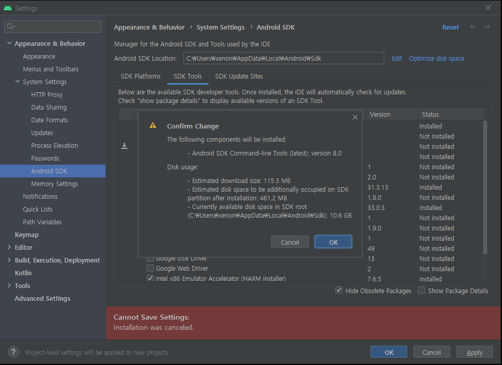 17. SDK Tools 탭을 클릭 후 Android SDK Command-line Tools 박스 체크 후 OK 버튼 클릭