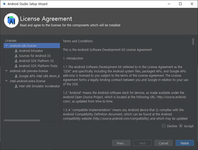 14. 모든 라이센스에 동의하셔야 합니다. 첫 화면에서 Accept 버튼을 클릭 후 나머지 preview, extra 도 클릭하여 Accept 를 각각 눌러준 후 Finish 버튼 클릭