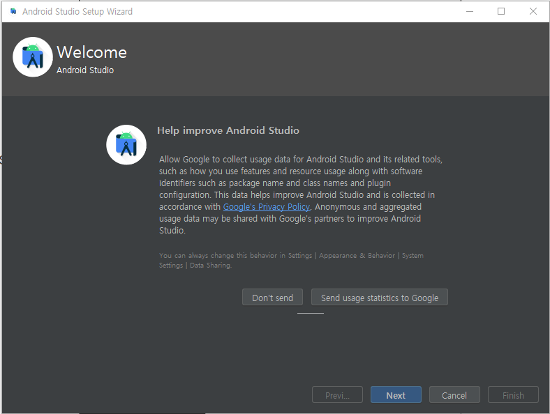 9. Google 에서 정보 수집에 동의하냐고 묻는건데, 원하지 않으시면 Don't send 버튼을 클릭하면 됩니다.