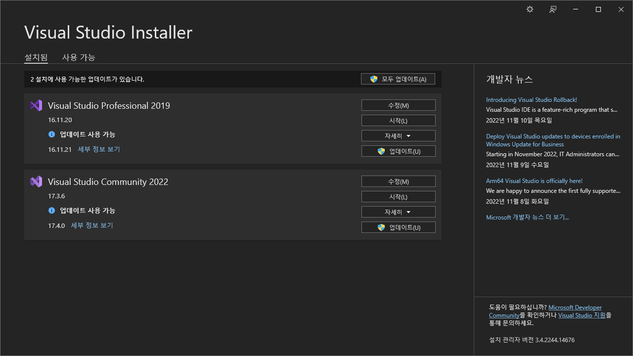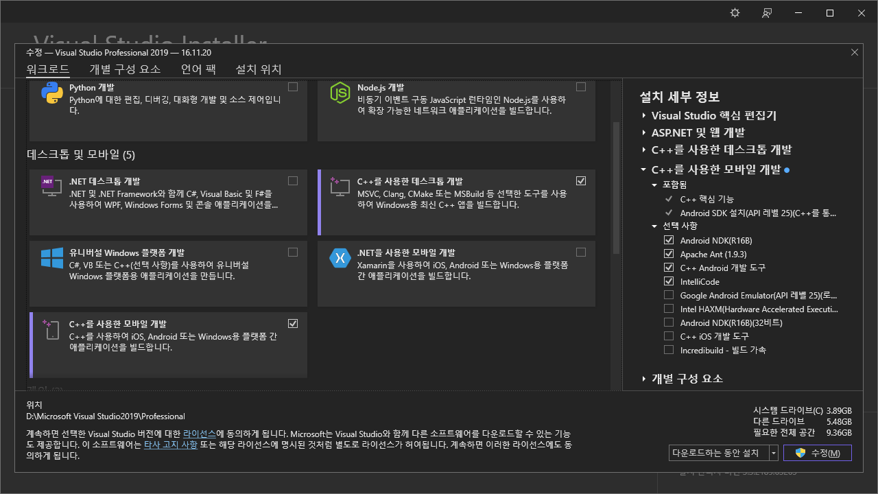 3. 데스크톱 및 모바일 탭에서 C++를 사용한 데스크톱 개발, C++를 사용한 모바일 개발 체크 후 수정 버튼 클릭