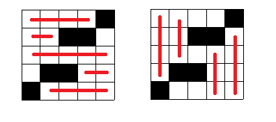 만약 방의 구조가 위의 그림처럼 생겼다면, 가로로 누울 수 있는 자리는 5개이고, 세로로 누울 수 있는 자리는 4개 이다. 방의 크기 N과 방의 구조가 주어졌을 때, 가로로 누울 수 있는 자리와 세로로 누울 수 있는 자리의 수를 구하는 프로그램을 작성하시오.