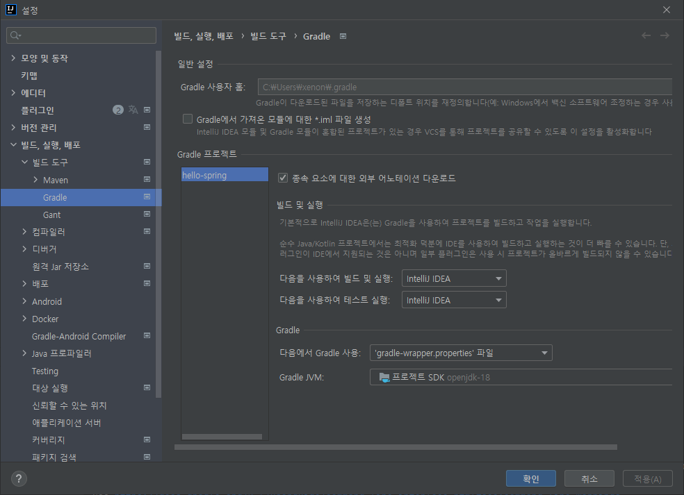 1. IntelliJ 설정 (Ctrl + Alt + S) > 빌드, 실행, 배포 > Gradle > Gradle JVM Java version 을 18로 수정