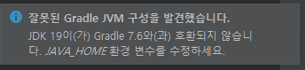 JDK 19이(가) Gradle 7.6와(과) 호환되지 않습니다. JAVA_HOME 환경 변수를 수정하세요.