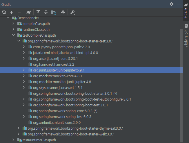 thymeleaf 라이브러리도 마찬가지로 스프링 부트와 관련된 라이브러리들을 전부 불러왔음을 확인할 수 있다.