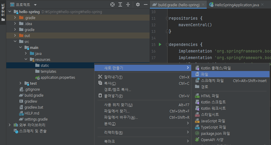 1-1. 프로젝트 탭 > src > main > resources > static > 새로 만들기 > 파일