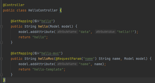 3-1. hello-template 를 반환하기 때문에 helloMvc 함수의 로직 내용의 결과를 hello-template.html 에 View 해준다.