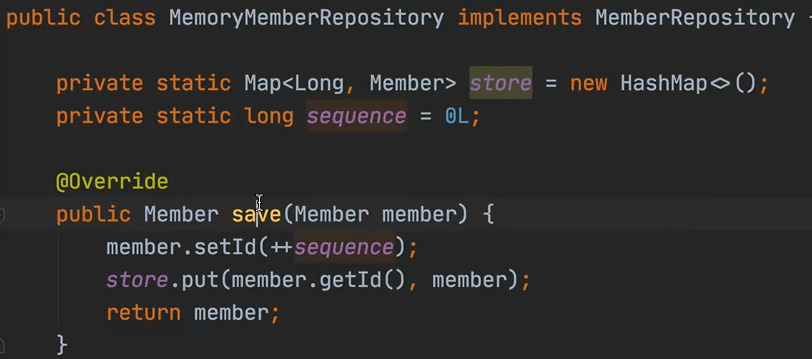 - java에서 우리가 작성했던 MemoryMemberRepository 클래스의 save 메소드에서 sequence 변수의 역할이 현재 id 가 자동으로 할당되는 역할과 로직이 같다.