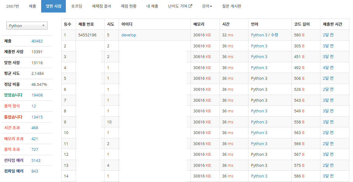 몰랐었는데, 계속 내 코드가 조회되길래 찾아보니까 파이썬 실행시간 1등이었다 ㄷㄷ 왜지?