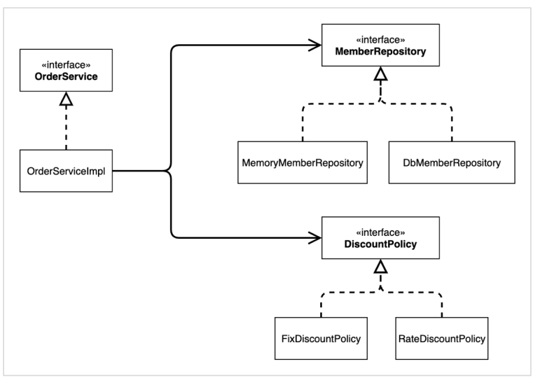 - 회원을 메모리에서 조회하고, 정액 할인 정책(고정 금액)을 지원해도 주문 서비스를 변경하지 않아도 된다.