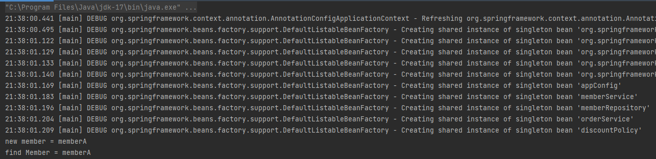 두 코드를 실행하면 스프링 관련 로그가 몇줄 실행되면서 기존과 동일한 결과가 출력된다.
