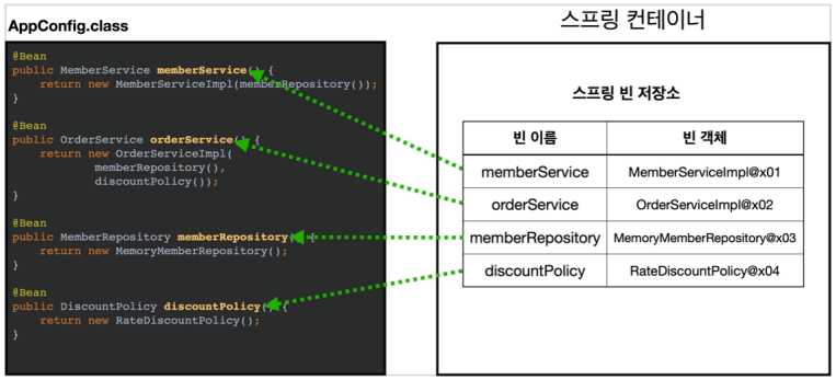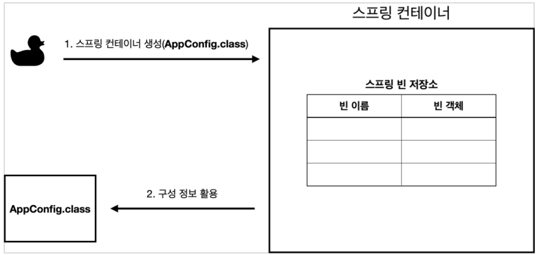 - 스프링 컨테이너는 파라미터로 넘어온 설정 클래스 정보를 사용해서 스프링 빈을 등록한다.