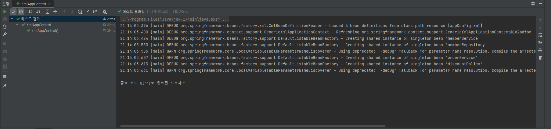 - GenericXmlApplicationContext 를 사용하면서 xml 설정 파일을 넘기면 된다.