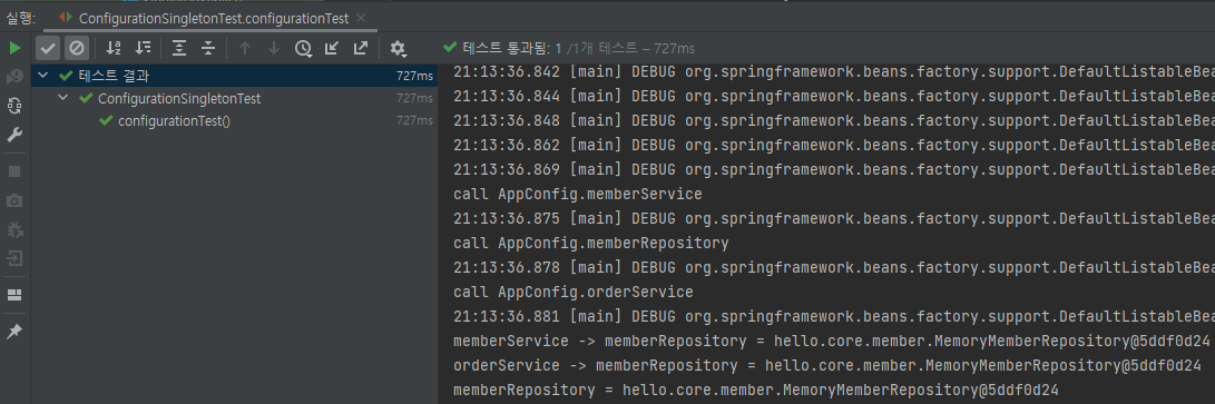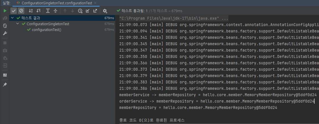 - AppConfig의 자바 코드를 보면 분명히 각각 2번 new MemoryMemberRepository 호출해서 다른 인스턴스가 생성되어야 하는데?