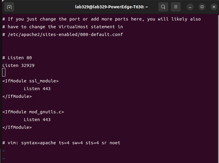 etc/apache2/ports.conf 파일을 수정하여 웹서버 연결 포트를 80에서 32929로 수정하였다.