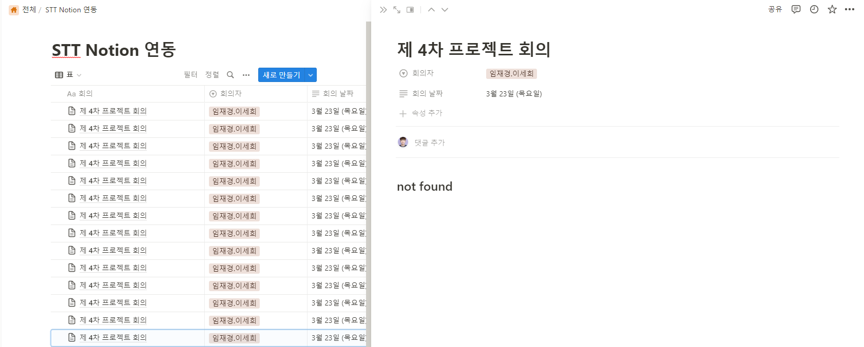- 예상 설계대로 STT가 변환에 실패하여 "not found"를 반환할 경우 정상적으로 변환된 값을 출력될 때까지 API를 재호출하여 원하는 값을 Notion 에 바로 작성하는 것을 성공했다.