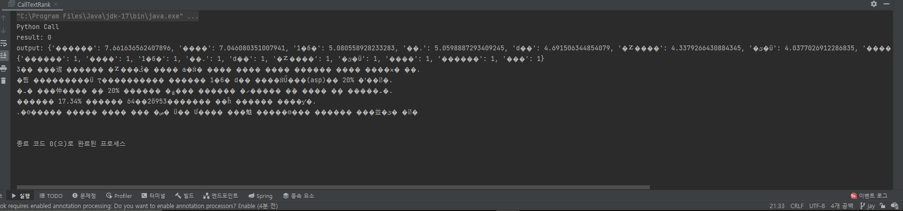 Java 코드, Python 코드 모두 utf-8 로 인코딩을 한 상태이고 인텔리제이 터미널도 확인했고, 자바 버전도 확인했고..