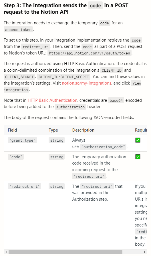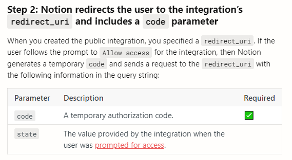 여기서 얻어온 code 를 사용해 우리는 사용자 노션 계정의 액세스 토큰을 얻어와야 합니다.