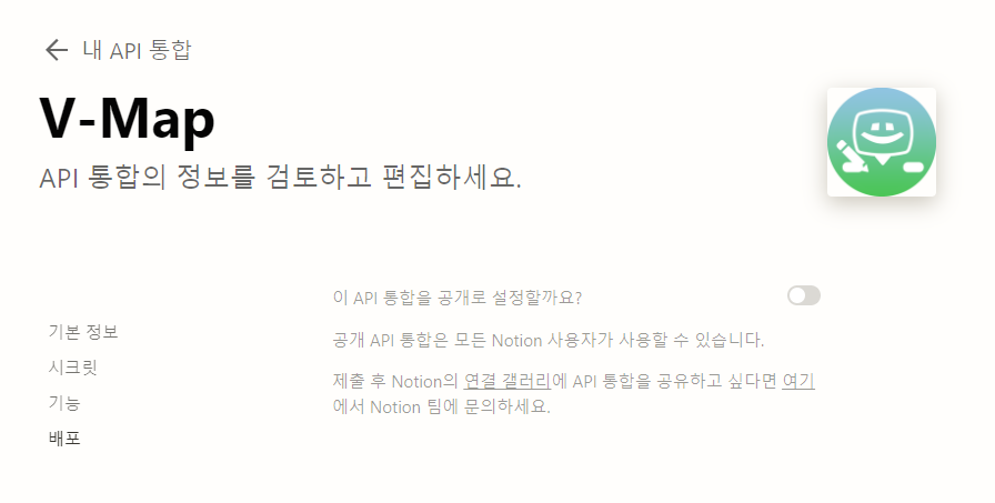 4. 배포 버튼을 클릭하고, API 통합을 공개로 활성화해주면, 새롭게 입력해야되는 정보들이 나옵니다.