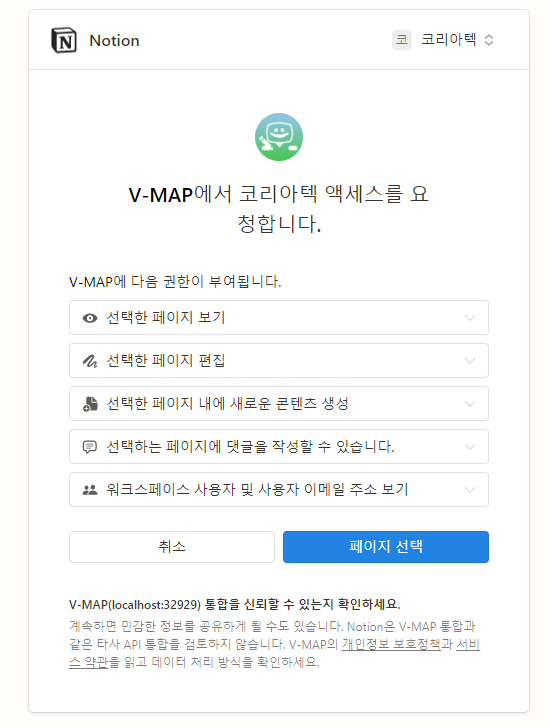14-1. localhost:32929/notionAuth 에 접속하면 자동으로 생성된 노션 인증 URL을 통해 인증 페이지에 접속하고,