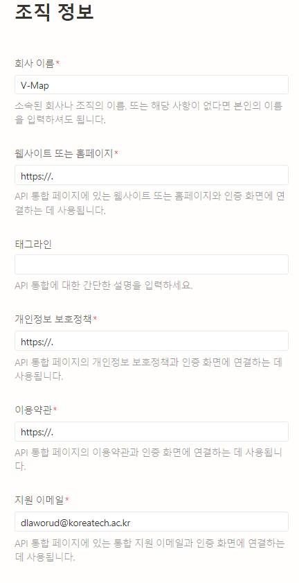 5. 조직정보, uri 는 임시로 입력해줍니다.