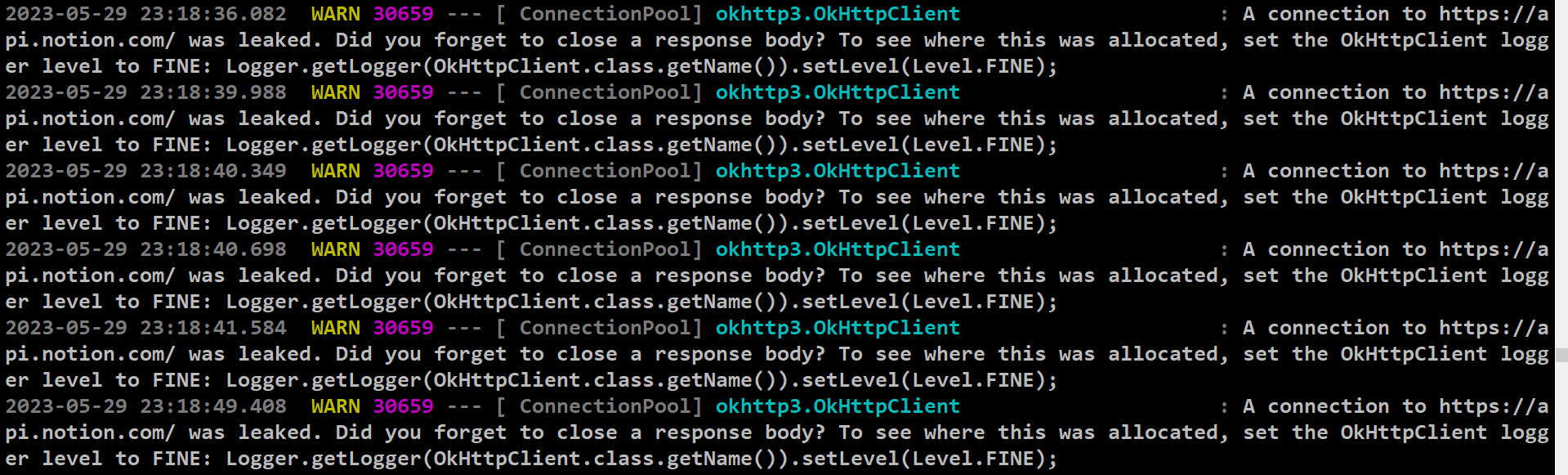 라는 경고 메시지는 OkHttp 라이브러리를 사용하여 HTTPS API인 https://api.notion.com/에 대한 연결이 누수(leak)되었음을 나타낸다. 이 경고는 HTTP 응답 본문을 닫지 않았을 가능성이 있다.