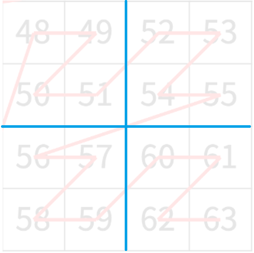 N > 1인 경우, 배열을 크기가 2N-1 × 2N-1로 4등분 한 후에 재귀적으로 순서대로 방문한다.