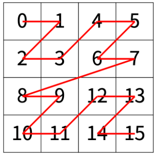 한수는 크기가 2N × 2N인 2차원 배열을 Z모양으로 탐색하려고 한다. 예를 들어, 2×2배열을 왼쪽 위칸, 오른쪽 위칸, 왼쪽 아래칸, 오른쪽 아래칸 순서대로 방문하면 Z모양이다.
