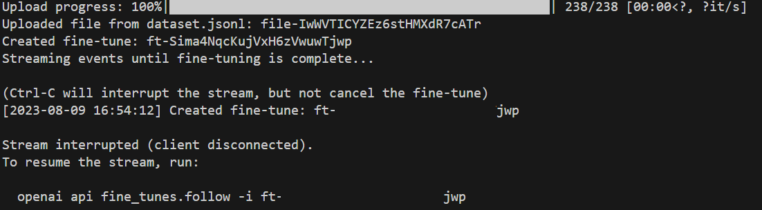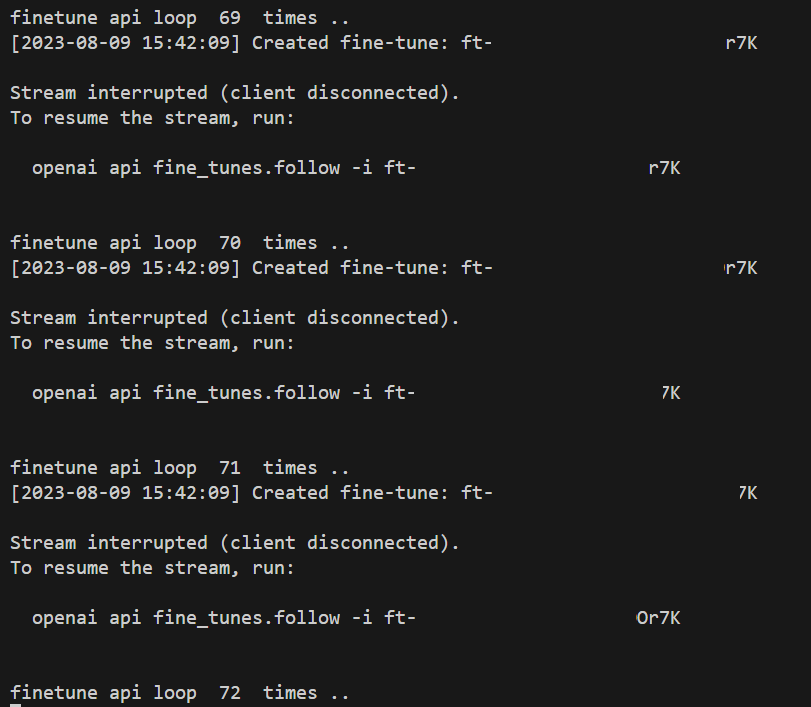Stream interrupted (client disconnected) during fine_tunes.follow