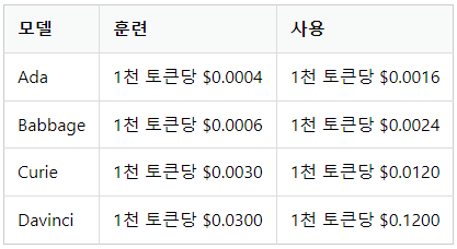 - "ada" 모델은 GPT-3 중에서 가장 작은 모델로, 대화형 챗봇이나 간단한 자연어 처리 작업에 활용될 수 있습니다.