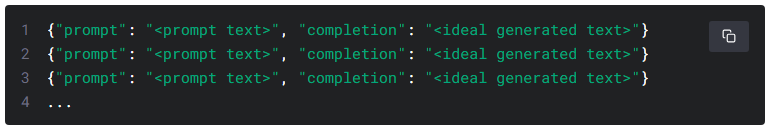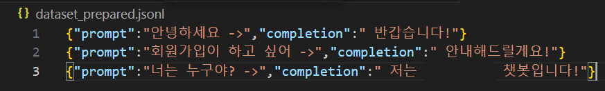 prompt : 질문, completion : 답변 형식에 맞춰 jsonl 파일로 담겨야 한다.