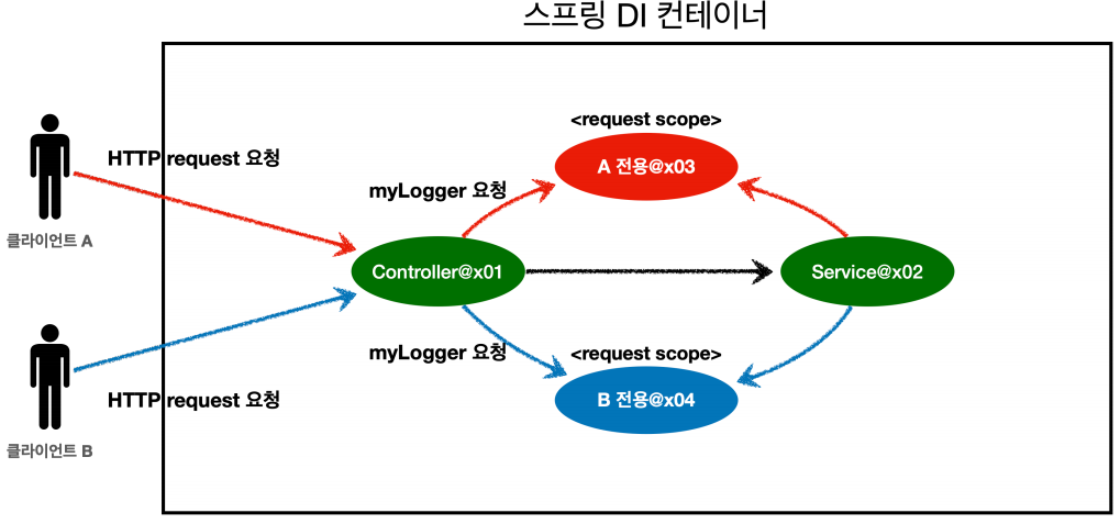 사실 세션이나, 서블릿 컨텍스트, 웹 소켓 같은 용어를 잘 모르는 분들도 있을 것이다. 여기서는 request 스코프를 예제로 설명하겠다. 나머지도 범위만 다르지 동작 방식은 비슷하다.
