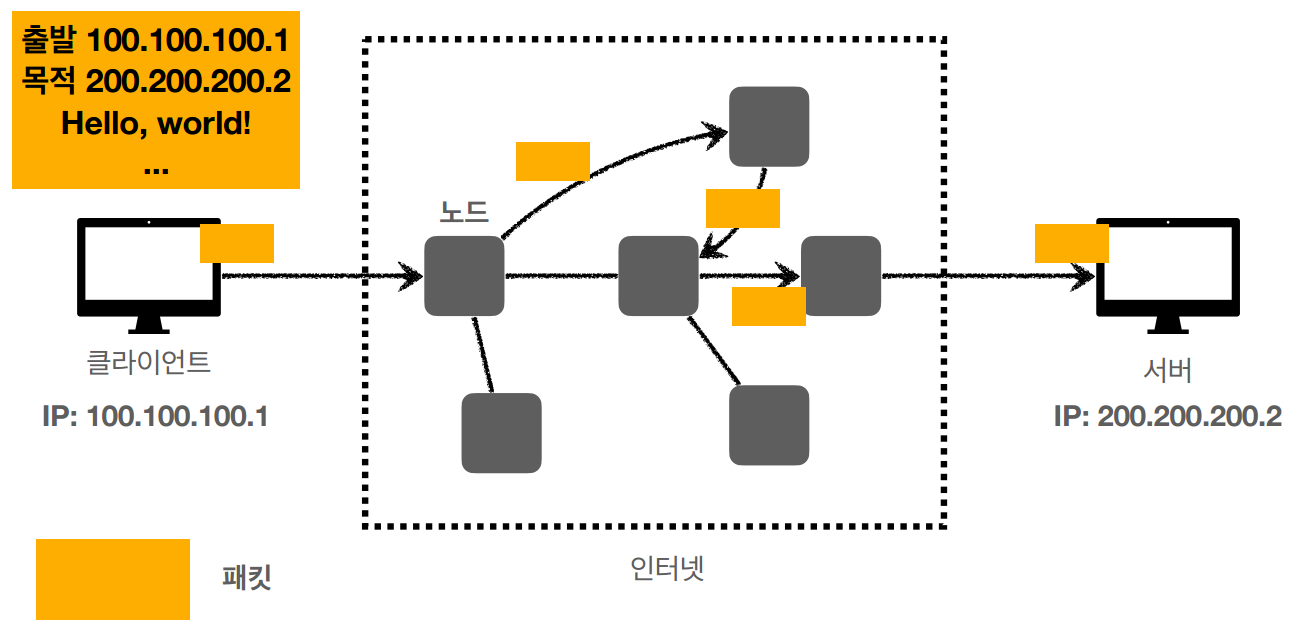 - 패킷(Packet)이라는 통신 단위로 데이터 전달
