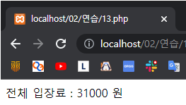 echo "전체 입장료 : $total_fee 원"; // 결과 출력