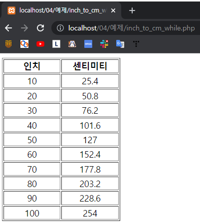 예제 4-5. while문으로 인치를 센티미터로 변환하기