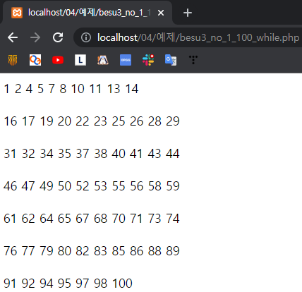 예제 4-4. while문으로 정수 1~100 중 3의 배수가 아닌 정수 구하기