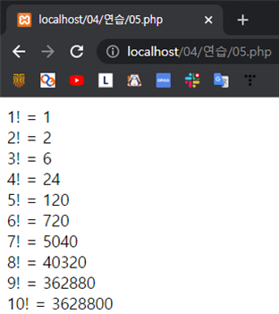 echo "{$num}! = $factorial<br>"; // 결과 출력