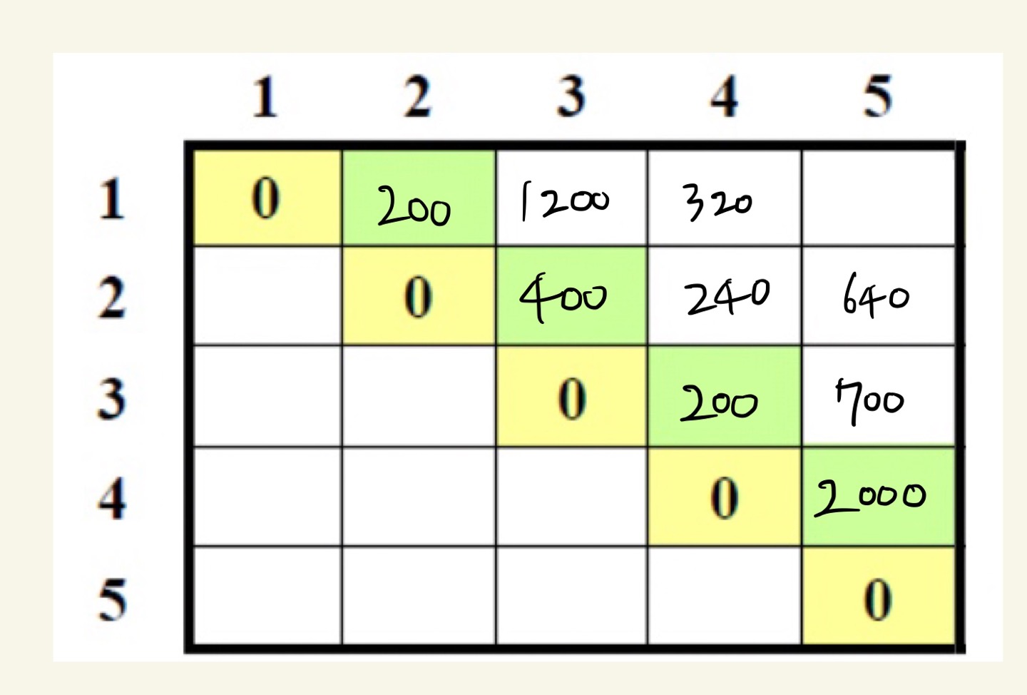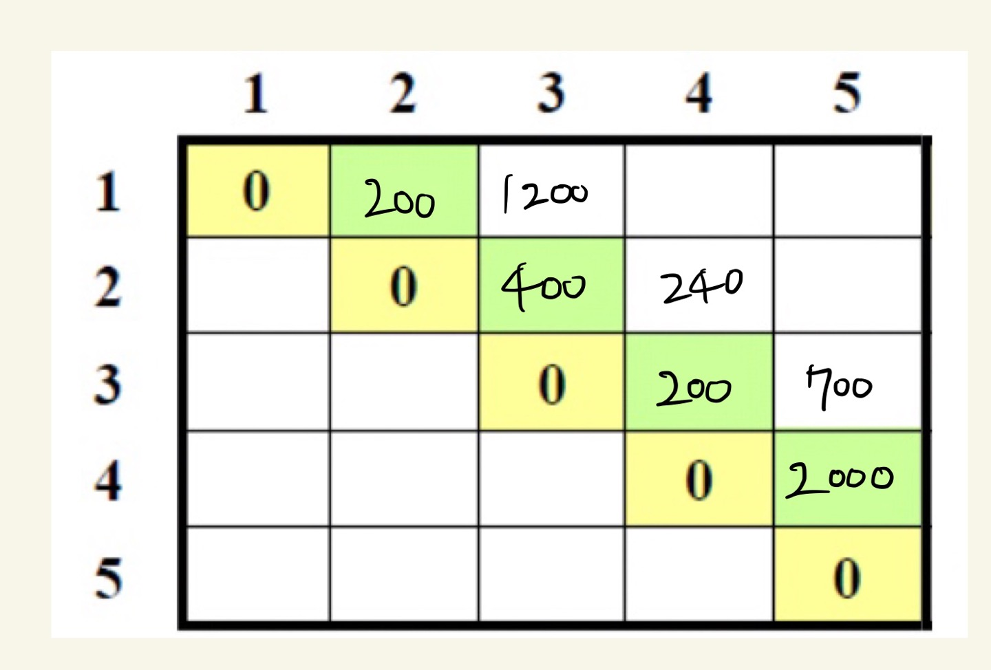 문제. 연쇄 행렬들의 곱인 A1 × A2 × A3 × A4 × A5를 계산하는 최적순서와 그 비용을 구하라.