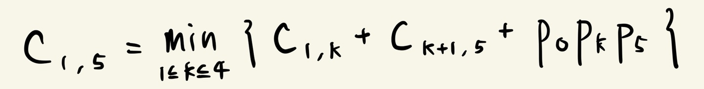 - 예를 들어, C1,5 를 구하기 위하여 다음과 같이 두 개의 부분으로 나누어서 계산한다고 생각하며, 두 부분으로 나누는 각 경우에 대해 가장 적은 곱셈 횟수를 산출하는 경우만을 선택합니다.