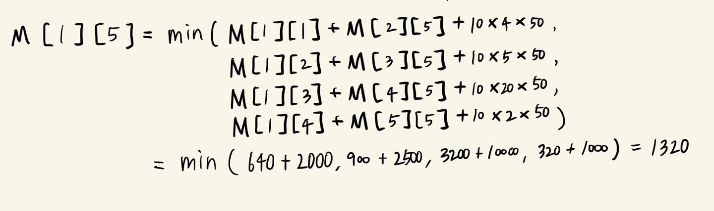 따라서, 최적의 순서 C1,5 = C1,4 + C5,5 + p0 × p4 × p5 이고, 비용은 1320 입니다.