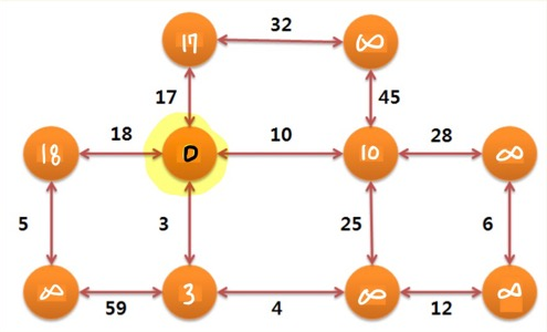 인접 노드들까지의 최단경로가 d[인접노드] 에 저장된 것을 확인할 수 있습니다.