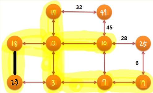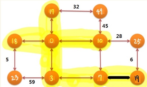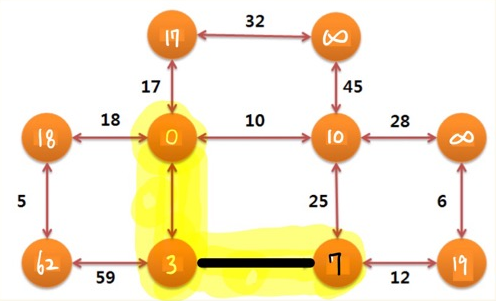 extract_min 함수를 통해 반환된 최소 가중치 노드는 7이고, d[7] = d[3] + 5 = 23 입니다.