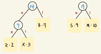 2) 선택된 각각을 left와 right child에 배치하는 새로운 노드를 생성하여 binary subtree 생성