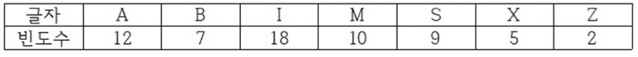 | 문 자 | 빈 도 | 원래(ASCII) 크기 | 압축된 크기 | 차이 |