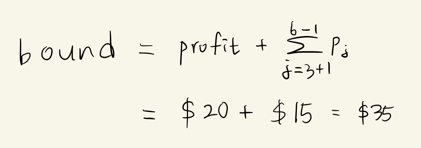 따라서 k=6이고, j=6이기 때문에 bound 는 profit 과 같습니다.
