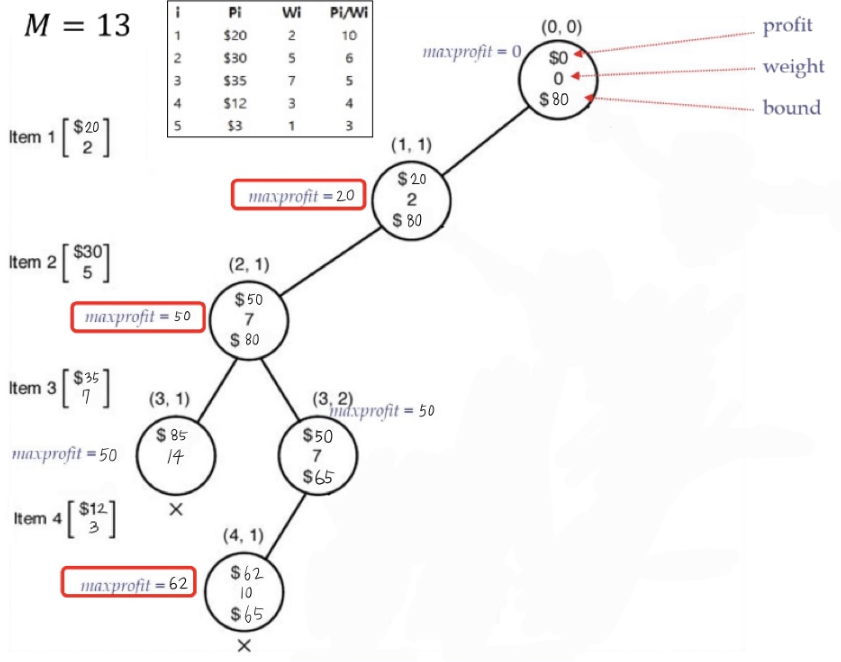 3. (weight < M) && (bound > maxprofit) 이면, 유망하다고 보고 가지를 뻗어나갑니다.