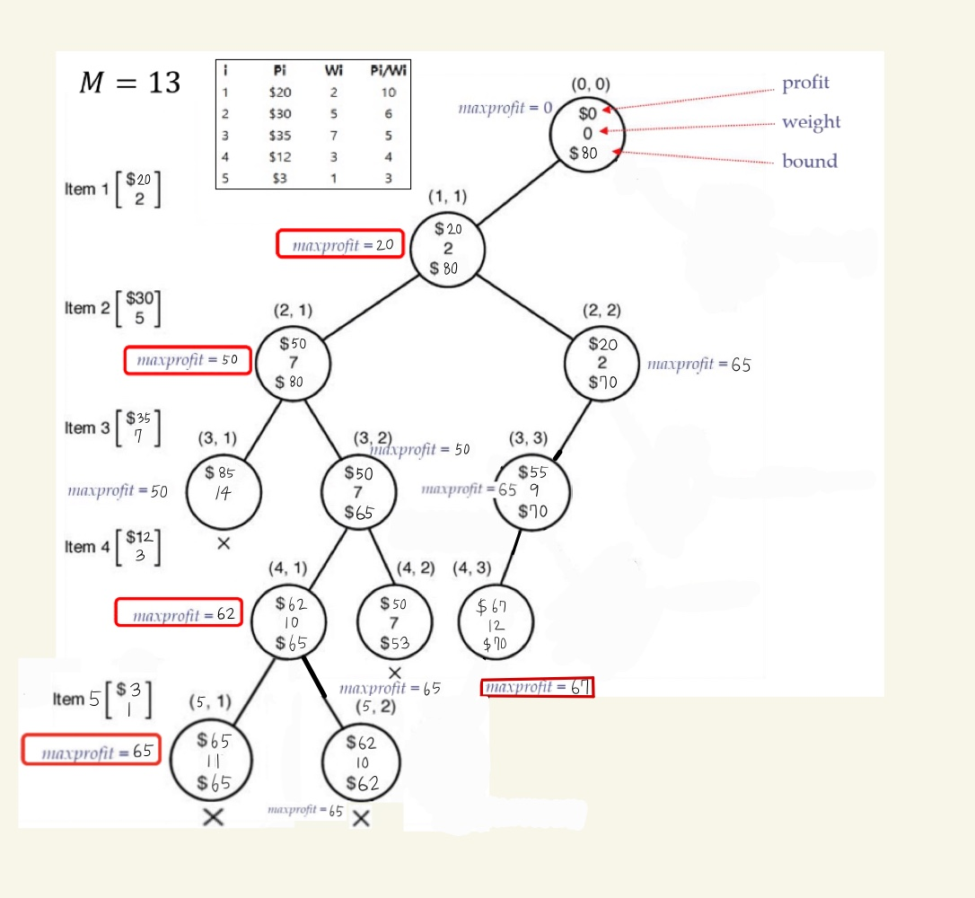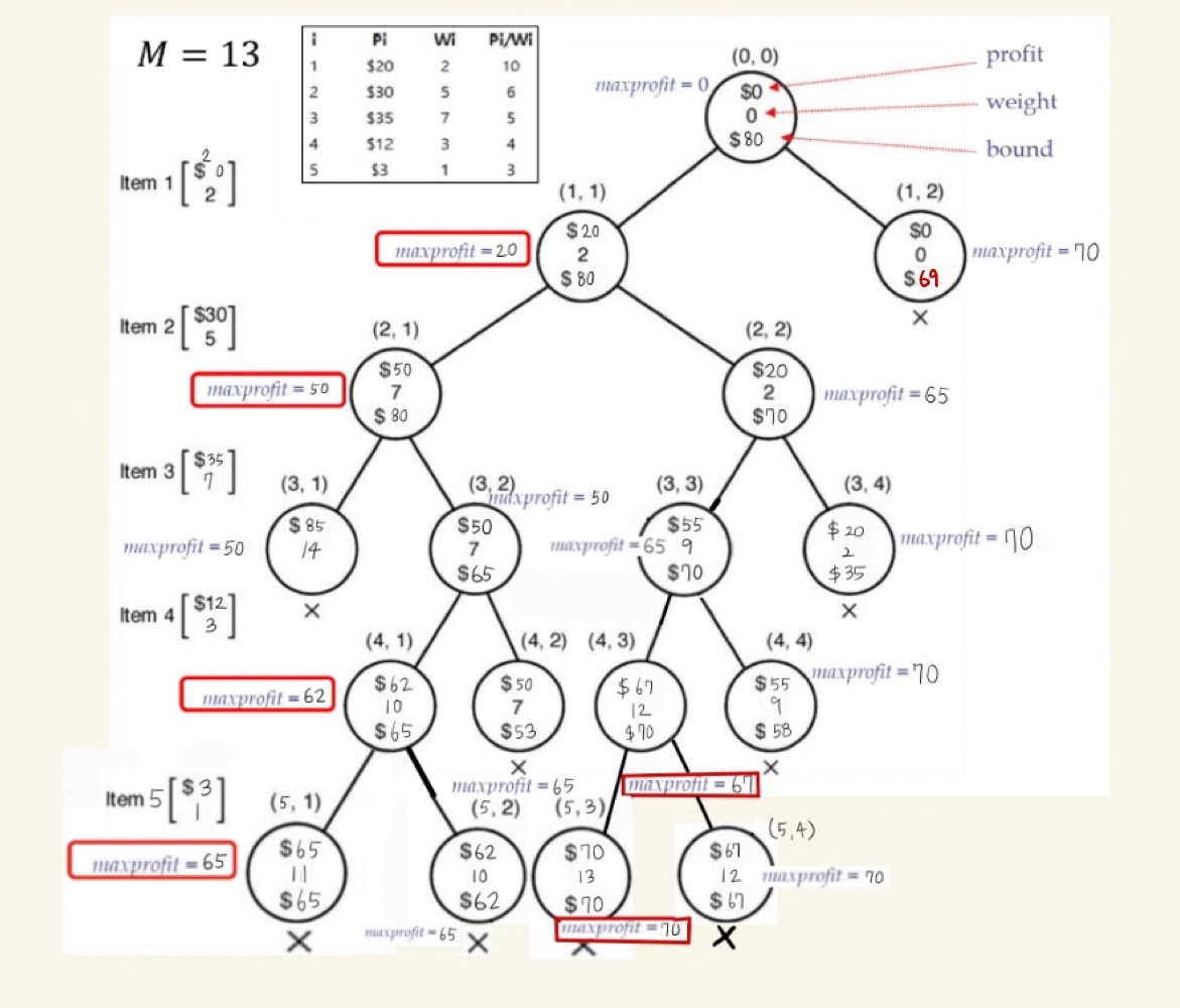1. (5,3)에서 profit = 70, weight = 13 이고, maxprofit 은 70입니다.