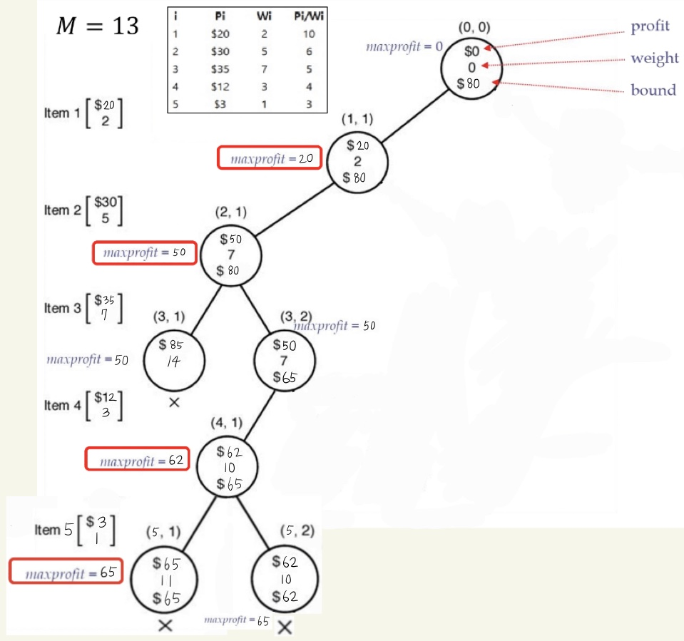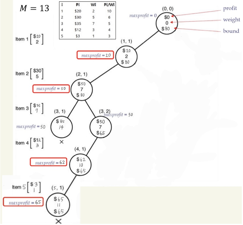 1. (3,1)에서 profit = 85, weight = 14 입니다. M = 13 < weight = 14 이므로 무게를 초과하였습니다.