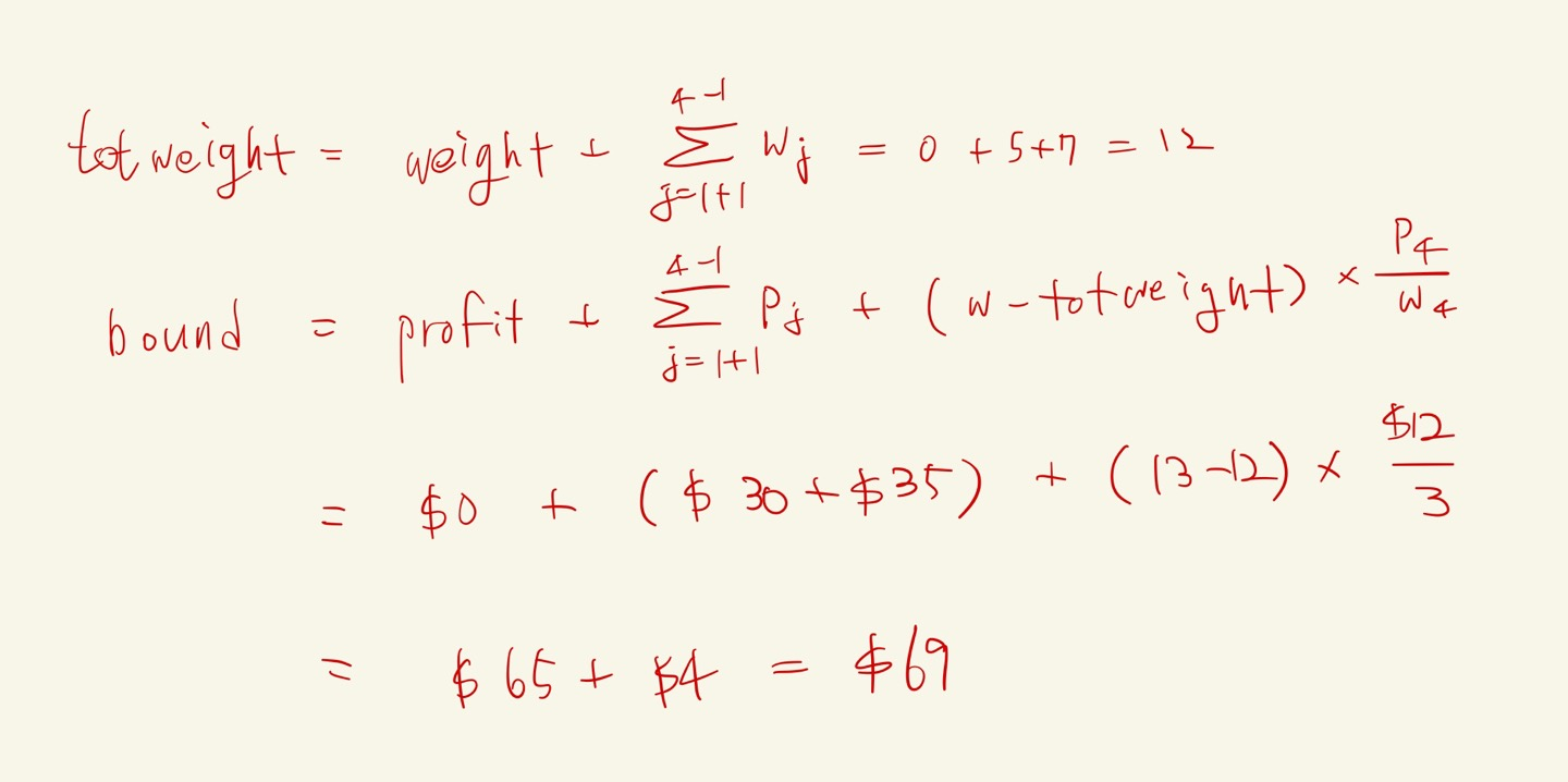 2 + 5 + 7 = 14 이고, 14 > 13(W의 값)이므로, 3번째 아이템을 취하면 무게의 합이 W를 넘습니다. 따라서 k = 3 이고, totweight 와 bound 는 다음과 같이 계산합니다.